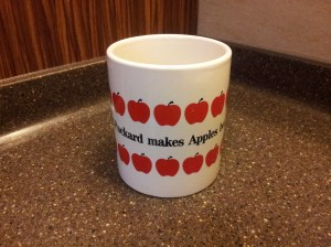 This mug was given out in the early 1990s during the launch of one of its first printers to run on the Apple platform. It aptly reads “Hewlett Packard makes Apples bear fruit”.
