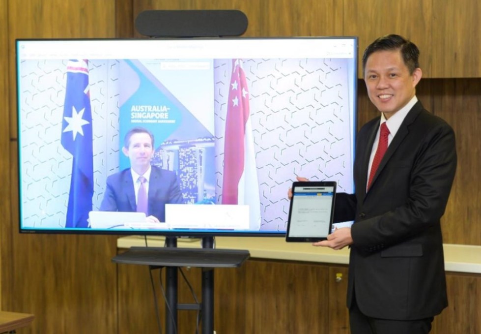 Singapore’s Minister for Trade and Industry Chan Chun Sing and Australia’s Minister for Trade, Tourism and Investment Simon Birmingham signed the agreement via videoconference today. (Photo: MTI/MCI/IMDA)